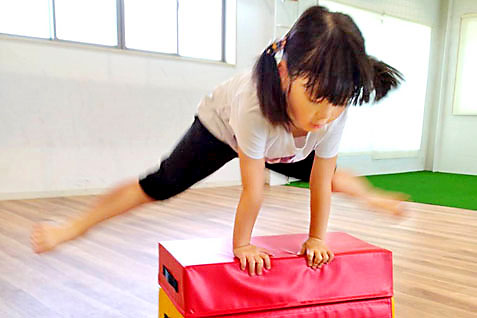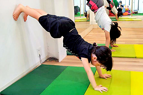 壁逆立ちでは、腕や肩などの体操全般に必要な上半身の力と体幹のバランスを鍛えます。