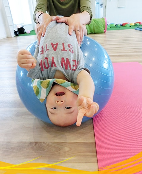 バランスボールを使って平衡感覚を養います。ママと一緒に左右に揺らしたり、ボールの上でジャンプします。子供たちに人気のバランストレーニングです。バランス感覚には脳の中でも、小脳が大きく関わっていると言われています。筋力は大人になってからでも、上げられますが、脳神経系は幼少期に発達します。