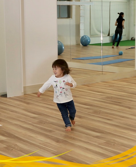 クールダウンは深呼吸やマッサージで身体と心をほぐします。お腹の音を聞いたり、関節可動域のチェツクをして日々の健康管理のポイントを確認します。あいさつの後はママがぎゅーっと抱きしめてくれるので、子供たちは「にこにこ」と充実感に満たされ元気にスタジオを後にします。