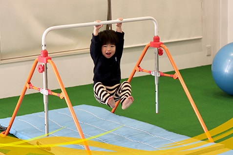 最初はママの指につかまる事から始めます。握る・つかまる力がついてくると鉄棒に10秒以上つかまれるようになります。順序立ててトレーニングをすれば、小学校に入学する前に逆上がりができるようになる子もたくさんいます。講師とママに沢山褒めてもらって子供たちはとてもうれしそうです。手・足には全身の反射区があるとされ、裸足で遊び、手を多く動かす事はとても良い事です。