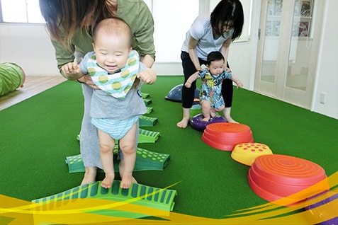 クラスでは様々な道具を使った運動や子供とのスキンシップを中心とした遊びを取り入れておられ、ゆったりとした気持ちで子供と向き合うことができ、毎週楽しみにしています。月齢の近いお子さんもおられるので、子供は周囲に興味津々で、良い刺激を受け楽しんでいます。